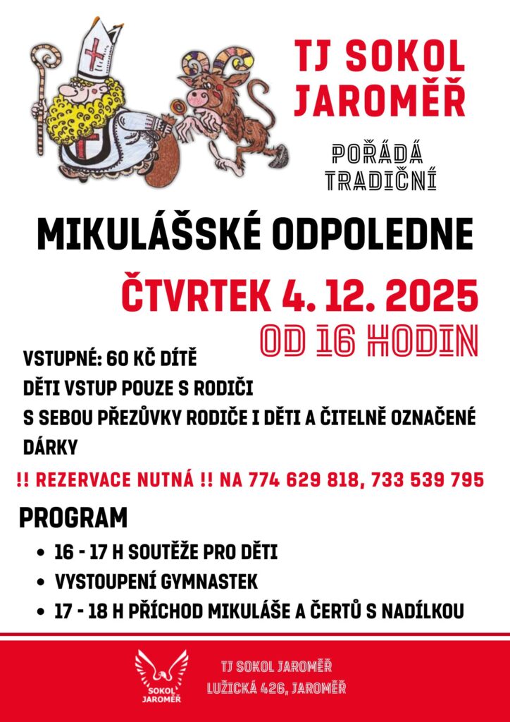 Začínáme v 16 h. Připravené pro vás budou soutěže pro děti, vystoupení gymnastek a poté přijde Mikuláš a čerti s nadílkou. V letošním roce jsme se rozhodli pro rezervaci míst, proto prosíme, abyste si včas vytvořili rezervaci na tel. číslech uvedených na plakátu. S sebou doporučujeme přezůvky i pro rodiče, od podlahy je chladno. Balíčky pro děti prosíme čitelně označit. Těšíme se na Vás.